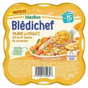 BCHEF Carrots 21.7%, Cooking water, Cooked Boulghour 15.0% (GLUTEN), Sweet potatoes 14.7%, Onions 8.73%, Chicken meat (origin: France) 8.48%, Courgettes 3.33%, Corn starch, Concentrated lemon juice 1.50%, Red peppers 1.33%, Extra virgin olive oil, Coriander 0.500%, Garlic, Salt, Turmeric, Cinnamon, Cumin, Muscade, Cloves.