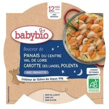 Parsnips from the Centre-Val de Loire* 33%, cooking water, carrots from the Landes* 30%, polenta from Italy* 4% (cornmeal*), vegetable oils* (rapeseed*, sunflower*), chives from France*. *Ingredients from organic farming.