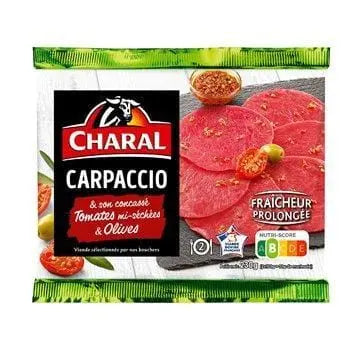 Marinated carpaccio 87%: beef 80%, spicy marinade 7% (rapeseed oil, natural flavourings); Adjacent pod 13%: rapeseed, sunflower and olive oils, green and black olives 3.5%, tomato concentrate 2.5%, semi-dried tomatoes 1.1%, capers (capers, water, salt, spirit vinegar), salt, garlic, sugar, parsley, oregano, acidifier: E330, preservative: E202.