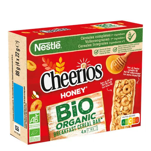Discover CHEERIOS ORGANIC cereal bars, crunchy rings with 5 organically grown whole grains, with delicious organic honey and organic milk! To take everywhere with you, your ORGANIC CHEERIOS cereal bars are also a source of fibre, without artificial colouring or flavouring.