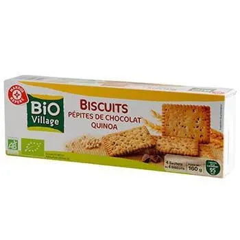 This product contains 62% wheat flour, palm oil, sugar, 11% chocolate chips (cocoa mass, sugar, cocoa butter, emulsifier: soya lecithin), 5.9% quinoa flour and flakes, salt, and raising agents: E500, E503. It may contain traces of nuts, milk, egg, and sesame. All ingredients are organically produced.
