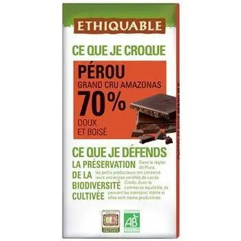 Fair trade and organic dark chocolate 70% PeruGrand cru Piura - soft and woody. The softness and finesse of this grand cru do not prevent it from presenting a beautiful aromatic palette, nicely highlighted with a cocoa content adjusted to 70%.