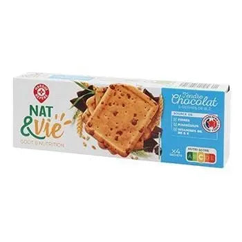 This product contains 50% wheat flour, sugar, rapeseed oil, 10% chocolate chips [cocoa mass, sugar, dextrose, emulsifier: lecithins (soya)], 6.8% crushed wheat germ, maize flour, low-fat yoghurt powder (skimmed milk, lactic ferments), semi-skimmed milk, raising powders: E503, E500, E450, natural flavour, maltodextrin, salt, oat fibre, minerals: magnesium, iron, vitamins: B1, B3, B6, B9, E. It may contain traces of nuts, eggs and sesame seeds. The product is manufactured in France, with chocolate processed in Germany, Belgium and/or France, and wheat flour processed in France.