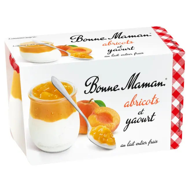 Sweetened stirred yoghurt 72%: fresh whole milk, fresh cream, sugar 2.5%, lactic ferments (milk). Apricot jam low in sugars good mother (30% less sugars) 28%: apricots 60%, sugar, concentrated lemon juice, gelling agent: fruit pectin.