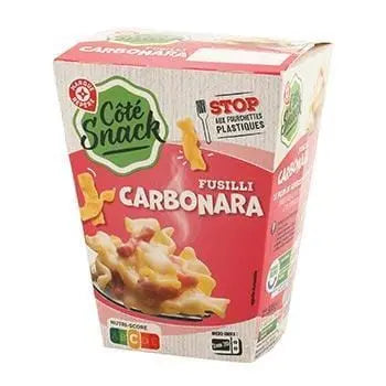 Cooked egg pasta, water, durum wheat semolina, egg, fresh cream, cooked smoked bacon, pork belly, salt, dextrose, antioxidant: E316, preservative: E250, semi-skimmed milk, melted emmental, emmental, milk, egg, water, butter, skimmed milk powder, whey powder, melting salt: E331, sunflower oil, lactose and milk protein, natural flavouring, modified potato starch, thickener: xanthan gum, pepper.