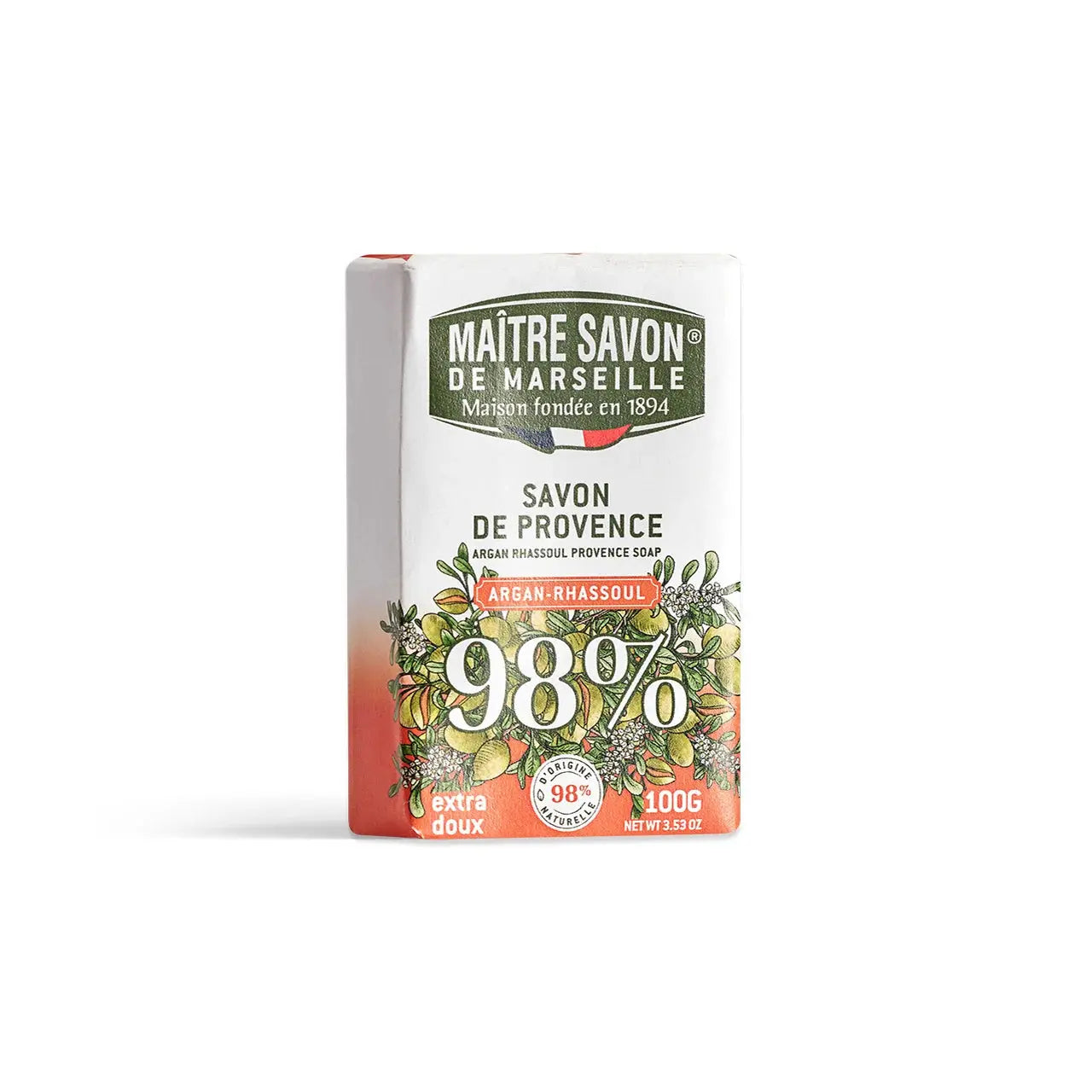 MAITRE SAVON extra-gentle Provence soap, made with 100% plant-derived oils. Delicately scented with oriental fragrances and enriched with organic argan oil, recognized for its moisturizing properties, this soap uses Rhassoul, a natural clay of volcanic origin, to cleanse and purify the skin.