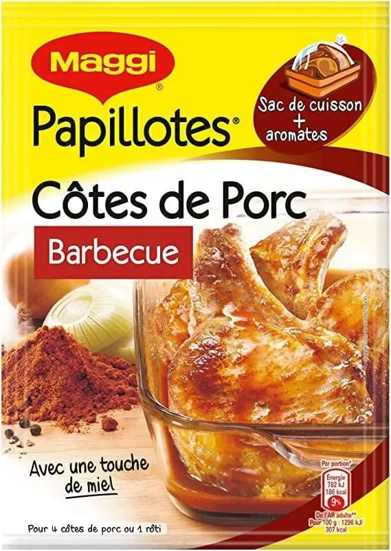 Reinvent your everyday dishes with Maggi Papillotes and its subtle blend of herbs and spices. You're sure to get a delicious, tender, juicy meat without adding fat. Pork ribs barbecue is the perfect way to make intense notes of honey in just aromatics garlic, ginger, coriander, cumin, chili, cinnamon, caraway, marjoram, horseradish, pepper, basil, cayenne, nutmeg, cornstarch, sugar, salt, potato, plain caramel preparation, starch, onion, flavourings, milk, yeast extract, sunflower oil, concentrated lemon juice. For industrial use. May contain celery, eggs, mustard, soybeans.