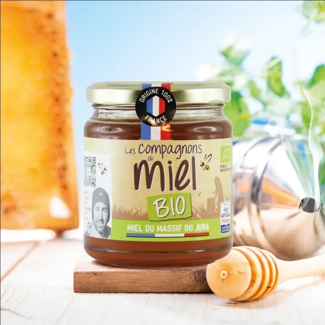 Organic honey from France made from a multitude of flowers and plant species gathered by bees in the heart of the Jura mountains: bramble, lime, acacia, hawthorn, dandelion or even fir. This exceptional organic honey is rare in its harvest volumes and reflects all the richness of the honeys of France and the biodiversity of our regions. This organic liquid honey is characterised by its clear liquid texture, its golden colour and its fresh, aromatic and woody aromas in the mouth. Its moderate intensity makes it a honey that appeals to all generations of honey lovers in France. The sensory identity of each honey reflects the flowers and plant essences skilfully gathered by the bees in a given area. Each jar of honey thus has its own history, colour and flavours.
