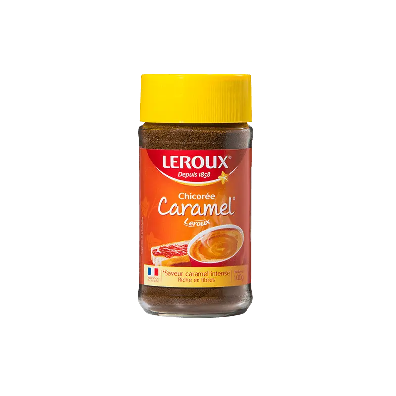 Chicory coffee, especially in the form of Chicoree-Caramel powder, is a versatile option for both hot and cold drinks. Whether mixed with milk or water, it creates an intense and balanced taste that makes every sip delightful. Perfect for breakfast, this instant café option brings a gourmet touch to your morning, offering a satisfying and rich flavor that everyone in the family can enjoy. Discover chicory in a new way with Leroux-style Chicory-Caramel powder, a blend of soluble chicory (90.8%), natural flavoring, and lean cocoa. This French coffee twist provides a unique experience for chicory enthusiasts.