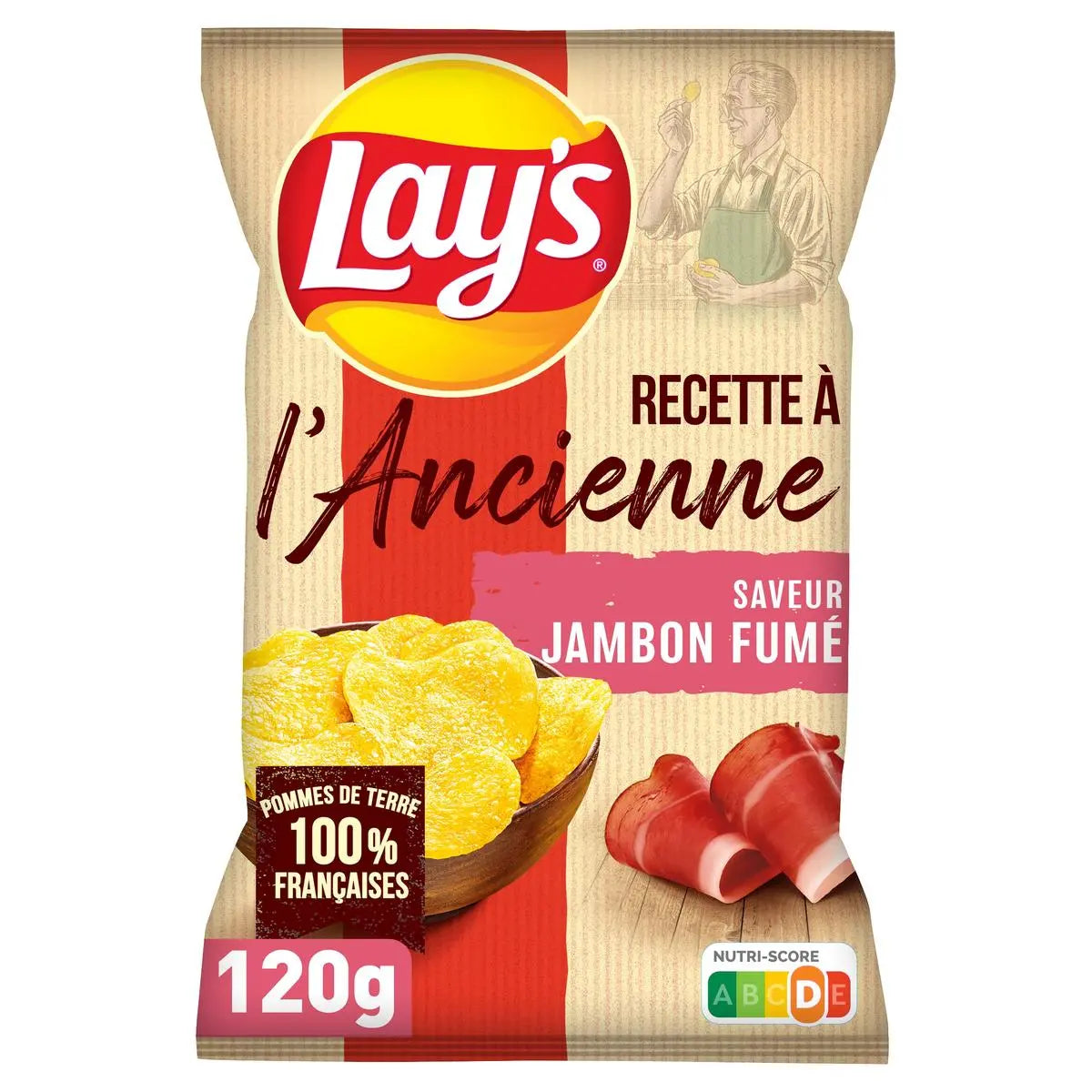 Experience the exceptional taste of Lay's® old-fashioned crisps. Crafted with traditional know-how, these thin, crispy chips are as delicious as ever. Each chip is a thin slice of potato, gently cooked to perfection. Our traditional recipe is revisited with 3 essential ingredients and a gourmet Smoked Ham Flavour.