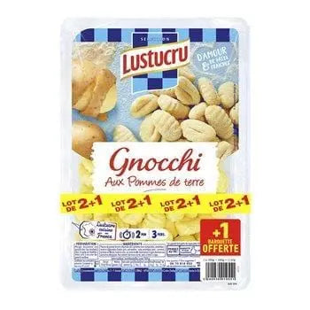Rehydrated potato flakes 66% (dehydrated potatoes, emulsifier: mono and diglycerides of fatty acids, antioxidant: ascorbic acid, spice: turmeric), hard WHEAT semolina, rapeseed oil, salt, WHEAT flour. Information in capital letters for allergy sufferers. May contain traces of milk, eggs and nuts. Packed in a protective atmosphere.