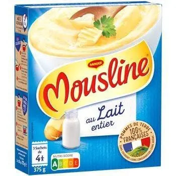 MOUSLINE Mashed potatoes with Milk combines good potatoes and the sweetness of whole milk for a tasty, gourmet mashed potato. Produced in Picardy with carefully selected French potatoes. No colouring, no preservatives, no flavouring. Recyclable cardboard. One box contains 3 bags for 4 people.