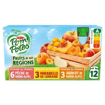 Pomme Mirabelle de Lorraine: apple from France 79.8%, mirabelle plum 20.0% (puree based on IGP mirabelle from Lorraine), natural flavour, concentrated lemon juice (if necessary to regulate acidity), antioxidant: ascorbic acid. Pomme Pêche de Rhône-Alpes: apple from France 74.8%, peach from Rhône-Alpes 25.0%, natural flavour, concentrated lemon juice (if necessary to regulate acidity), antioxidant: ascorbic acid Pomme Abricot de Rhône-Alpes: apple from France (puree, concentrated puree) 69.9%, apricot from Rhône-Alpes 30.0%, concentrated lemon juice (if necessary to regulate acidity), antioxidant: ascorbic acid.