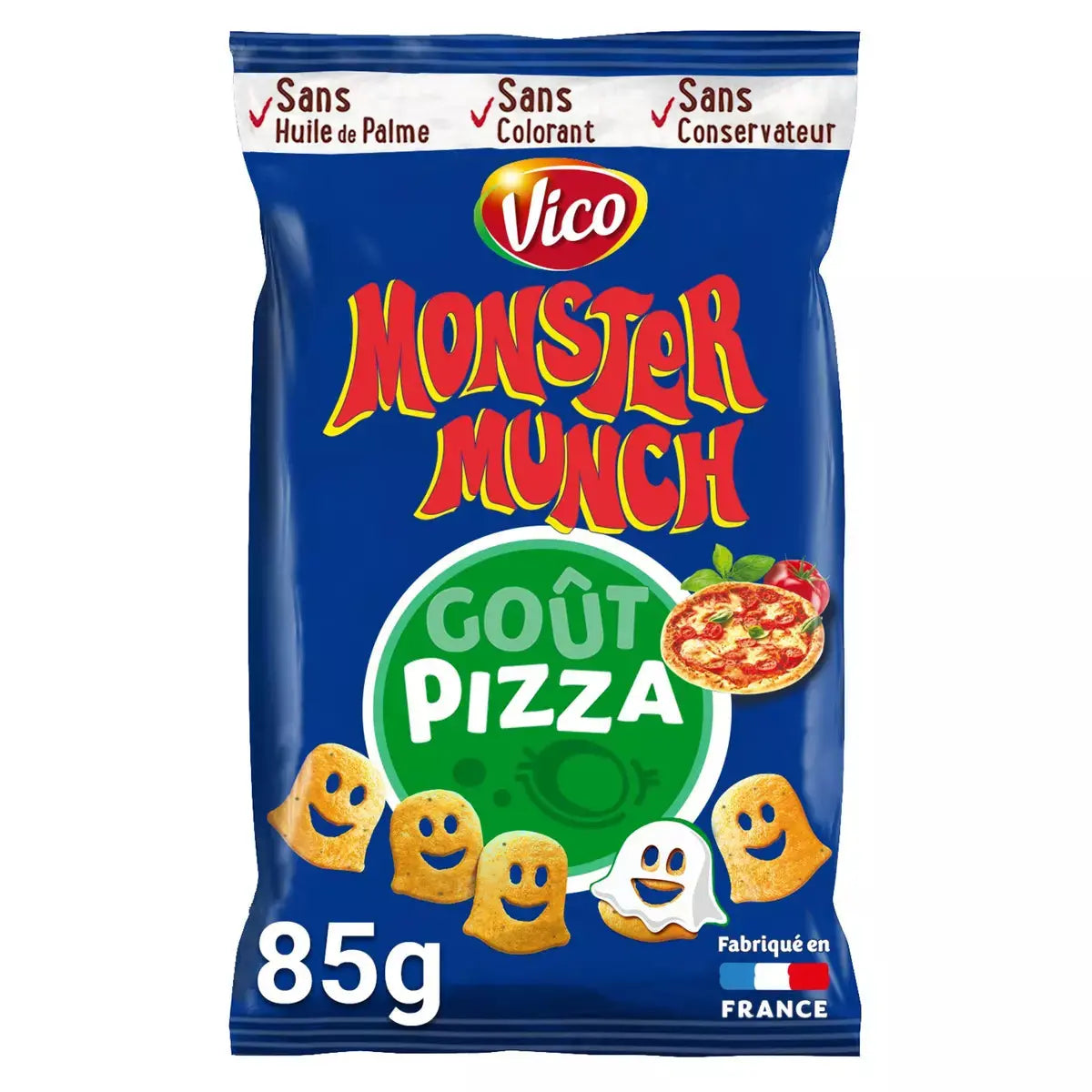 Pizza-flavoured little monsters with a great potato flavour. With their light, crispy texture, Monster Munch can be enjoyed on a variety of occasions. As an aperitif with your parents or as a snack after sport, they can also be enjoyed as an accompaniment to a balanced meal. A Vico quality-certified recipe, with no colourings, no preservatives, no palm oil and made in France.