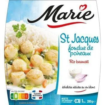 Savour the delicate elegance of French coastal cuisine with Marie Scallops Cream of Leek Rice 280 g. This refined ready meal features tender scallops (Coquilles Saint-Jacques) served in a silky leek and cream sauce, accompanied by perfectly cooked rice. A harmonious blend of sea and land, this dish offers the authentic taste of Brittany and Normandy — gourmet and comforting, ready in minutes.