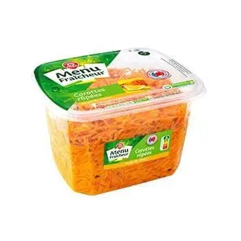 This product is a blend of grated carrots (80%), water, rapeseed oil, chives (2%), and lemon juice from concentrate (1.7%). It also contains mustard (water, mustard seeds, vinegar, salt), sugar, vinegar, pepper, garlic, salt, modified potato starch, and a thickener: xanthan gum. It is preserved with E202 and may contain traces of celery. The product is manufactured in Belgium, with carrots sourced from France and lemons from Argentina, Spain, and/or Italy, depending on supplies and/or tasting characteristics searched for.
