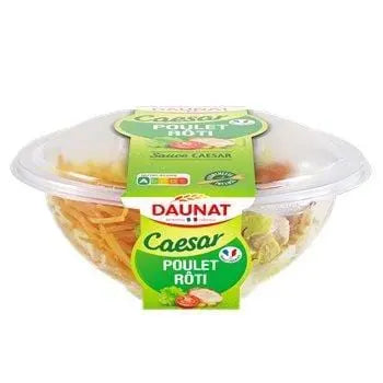 Salad 36%, cooked prepared cured roast chicken meat 16% (chicken meat origin FRANCE, sunflower oil, acidifiers: potassium lactate - sodium acetate, salt, stabilisers: Processed Euchema seaweed - triphosphates, dextrose, potato starch, brown sugar, spirit vinegar, antioxidant: sodium ascorbate), corn 14% (corn, sugar, salt), Caesar sauce 14% [water, rapeseed oil, spirit vinegar, MUSTARD (water, MUSTARD seeds, spirit vinegar, salt), salt, sugar, CHEESE (MILK, salt, rennet), EGG yolk, garlic, natural flavouring (contains MILK), ANCHOVY powder, thickener : xanthan gum, pepper], carrot 13%, cherry tomato 6%, water, ferments. Information in bold for allergy sufferers. Possible traces of gluten, egg, fish, shellfish, celery, sesame seeds, soya, nuts.