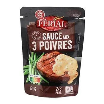 This product is a blend of water, 15% cream, semi-skimmed milk, and 4.8% white wine. It also contains modified tapioca starch, flavoured veal stock powder, sunflower oil, flavouring, green pepper, black pepper, pink berries, salt, colouring: E150b, and white pepper. The cream is processed in the European Union and the pepper originates from Brazil, India, Madagascar, and Malaysia. It is manufactured in France.