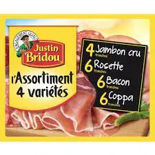 The 4 Varieties Assortment, ideal for a convivial meal. All the must-have cured meats selected by Justin Bridou: top-quality Rosette, Beechwood-smoked Bacon, finely sliced Aoste raw ham and finely peppered Coppa. An ideal assortment for your charcuterie platters and convivial raclettes with family and friends!
