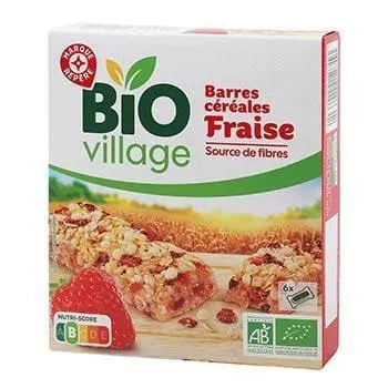 Ce produit est fabriqué à partir d'une variété d'ingrédients biologiques, y compris du sirop de glucose, des flocons d'avoine, de la farine de blé, des pétales de maïs, du sucre, de la farine de riz, de l'huile de tournesol, des fraises lyophilisées, de la farine de malt d'orge, de la farine de maïs, et un arôme naturel de fraise. Il est produit en France avec des ingrédients provenant d'Europe et des fraises d'Afrique, d'Asie et/ou d'Europe. Veuillez noter que ce produit peut contenir des traces d'arachides, de noix et de lait.