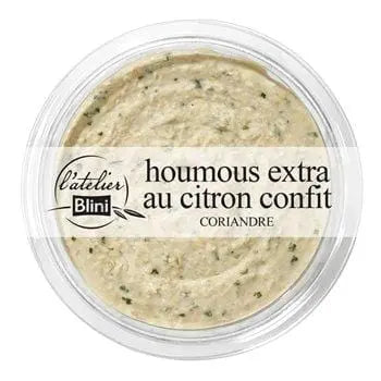 Pois chiches 45 %, eau, huile de colza, pâte de sésame, écorce de citron confite 5 % (écorce de citron, sirop de glucose-fructose, saccharose, régulateur d'acidité : E330), sel, coriandre 0,6 %, acidifiant : E330, jus de citron concentré, conservateur : E202.