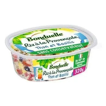 Riz (52%), tomates (11%), THON (7%), pois (4%), maïs doux (4%), olives noires (4%), poivrons, vinaigre d'alcool, huile de colza, huile d'olive extra vierge, basilic (0,9%), sel, MOUTARDE de Dijon (eau, graines de MOUTARDE, vinaigre d'alcool, sel), sucre, épaississants : gomme de guar - gomme xanthane, arômes naturels. Fabriqué dans un atelier qui utilise également : gluten, lait, œuf, céleri, crustacés, soja, noix.
