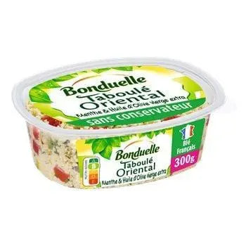 Sémez de blé dur réhydraté (62%), poivrons (11%), tomates (6%), huile de colza, oignons, concombres (3%), vinaigre d'esprit, menthe douce (1%), huile d'olive extra vierge (1%), persil, raisins (1%)(raisins, huile de colza), sucre, sel, arômes naturels, épices (0,2%), plantes aromatiques. Peut contenir des traces de : lait, œuf, céleri, moutarde, poisson, crustacés, fruits à coque, soja.