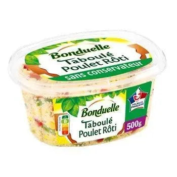 Sémoule de WHEAT dur réhydratée (57%), filet de poulet rôti cuit et séché (8%)(filet de poulet (84%), eau, fécule de manioc, dextrose de WHEAT, sel), poivrons (8%), huile de colza, maïs (5%), tomates (5%), pois (4%), vinaigre d'alcool, ciboulette, sel, arômes naturels, sucre, épices (0,2%). Fabriqué dans un atelier utilisant également : lait, œuf, céleri, moutarde, poisson, crustacés, soja, noix.