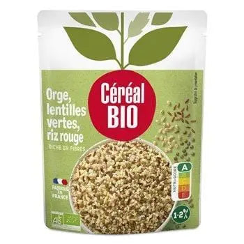 Eau, boulgour d'orge* 26,8%, lentilles vertes hydratées* 11,6%, riz rouge complet* 3,4%, huile d'olive extra vierge*, huile de tournesol*, sel de mer, * Ingrédients cultivés biologiquement. Fabriqué dans un atelier utilisant du CELERI, des NOIX, de la MOUTARDE, des ŒUFS, du LAIT, du SESAME et des SOJA.