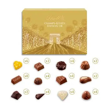 Lindt Champs-Élysées Édition Or Champs-Élysées par Lindt a créé la boîte d'assortiment la plus étincelante pour Noël : un étui doré, une recette de chocolat au sucre pétillant, pour des sensations nouvelles et pleines de surprises, et un assortiment de chocolats fins au lait, noir et blanc. Avec la boîte Lindt Champs-Élysées Édition Or, le chocolat est en fête !
