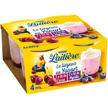 Yaourt sucré (52,7%) [Lait écrémé, crème (lait), sucre (4%), poudre de lait écrémé, protéines de lait, ferments lactiques (lait)], fruits : framboise (15,6%) ou fraise (15,5%), lait entier, crème (lait) (8,7%), eau, sucre (6,8%), poudre de lait écrémé, fécule de maïs, gélatine bovine, épaississant (pectine), arômes naturels, jus de citron, jus de carotte concentré, fibres d'agrumes, concentré minéral de lait, arôme. Lait provenant de France. *Pas de couleur artificielle : la couleur est fournie par des extraits de plantes.