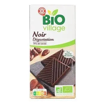 Masse de cacao, sucre, beurre de cacao, émulsifiant : lécithine (tournesol), extrait de vanille. Traces de fruits à coque, gluten et lait. Cacao : 74% minimum.
