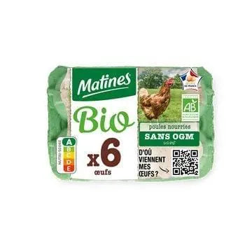 Œufs de plein air issus de l'agriculture biologique. Les poules sont nourries sans OGM (<0,9%), conformément aux réglementations de la production biologique et aux bonnes pratiques agricoles.