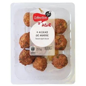 Acras de morue : viande de morue 35 %, oignon, huile de tournesol, eau, fécule de manioc, protéine de BLÉ et fécule, farine de BLÉ, persil, poudre de blanc d'ŒUF, ail, agents levant (E450i, E500ii, fécule de BLÉ), poivron rouge, sel, piment. Sauce aigre-douce : eau, sucres, vinaigre, ananas, poivron rouge, amidon de maïs modifié, huile de tournesol, sel, acidifiant : acide citrique, épices et herbes, stabilisants : gomme de guar, gomme xanthane.