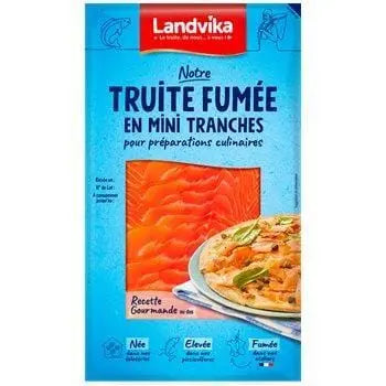 Petites tranches de truite fumée salées avec du sel sec et fumées avec du bois de hêtre.