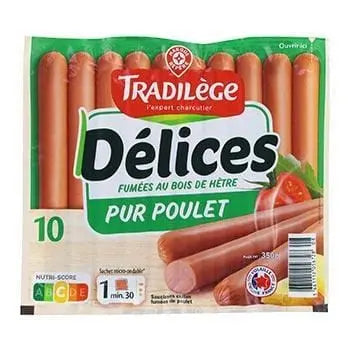 Viande de poulet (d'origine française), peau de poulet, eau, conservateurs : E250-E326, sel, sirop de glucose, graisse de poulet, fibres de pois, arômes de fumée, agents de texture : E450, protéine de pois, saccharose, antioxydant : E301, épices, ferments. Peut contenir des traces de lait, d'œuf, de gluten et de noix.