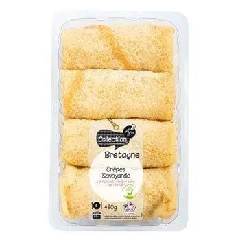 Crêpe 50 % (farine de BLÉ, lait entier frais, œufs entiers de poules élevées en plein air, sucre, huile de tournesol, sel), pommes de terre 12 %, eau, choix de jambon cuit (jambon de porc, eau, sel, dextrose, bouillon (bette, acerola, carottes), arôme naturel, ferments), bacon fumé cuit 5,4 % (poitrine de porc, eau, sirop de glucose, sel, arômes naturels, aromatiques, ferments), REBLOCHON AOP 5,4 % (colorant de croûte : annatto), oignon pré-frit (dont huile de tournesol), CRÈME (dont stabilisant : carraghénane), fécule de maïs, vinaigre d'alcool, jus de citron, sel. Préparé à partir de viande de porc d'origine française.