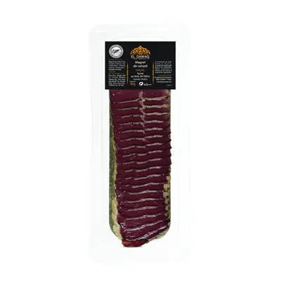 Profitez de la riche saveur fumée de notre filet de canard Halal. Provenant de France et fumé avec du bois de hêtre, ce produit est un délice gourmet. Il est assaisonné avec du sel de Guérande et des arômes naturels, et conservé avec du nitrite de sodium et de l'érythorbate de sodium. Pour chaque 100 g du produit fini, nous utilisons 114 g de filet de canard.
