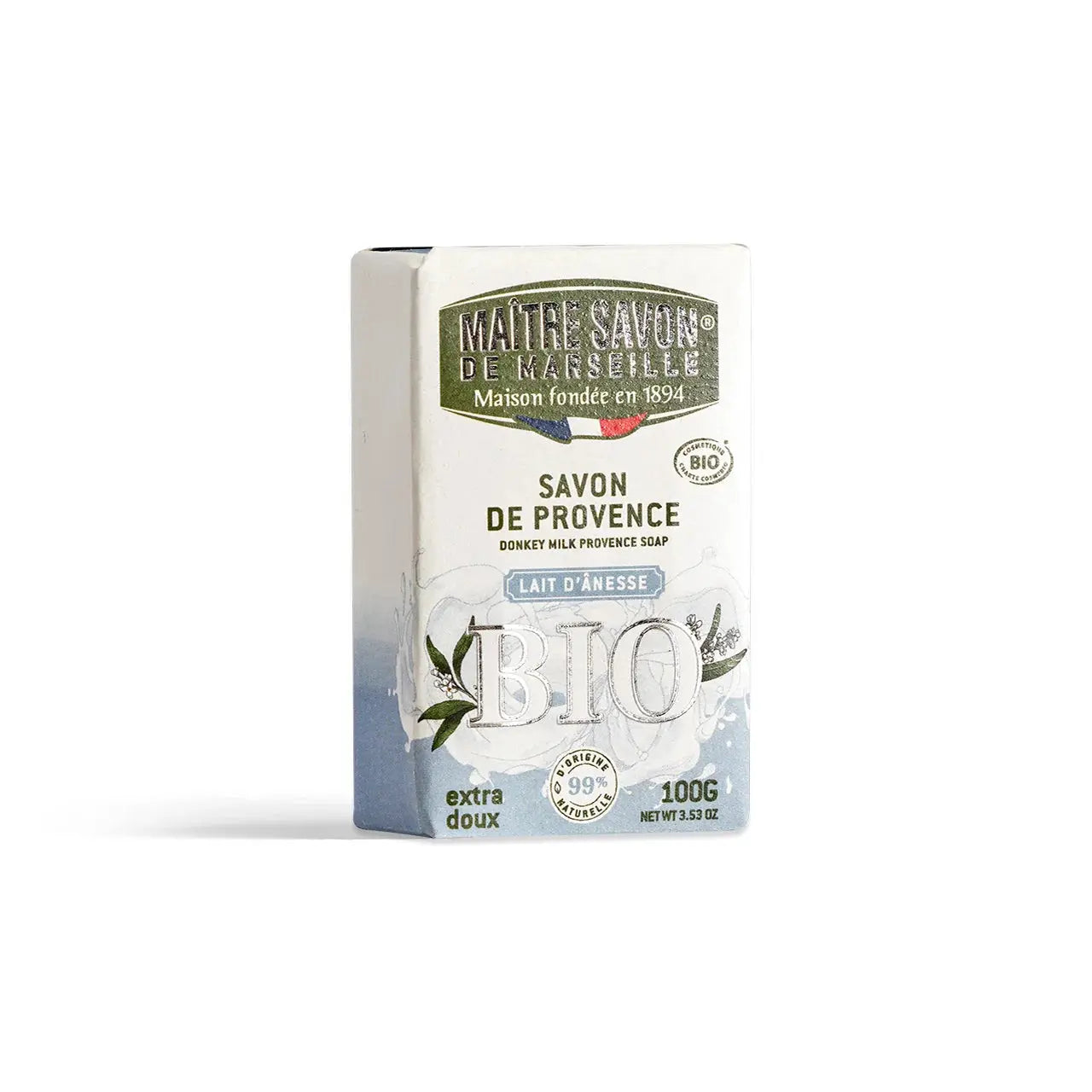 Le savon MAITRE SAVON Provence, certifié Cosmos Organic, est fabriqué à partir d'huiles végétales 100% et de parfums naturels. Ce savon au lait d'ânesse est idéal pour l'hygiène des mains et du corps, nettoyant en douceur et parfumant délicatement votre peau. Taille : 100g