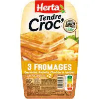 Profitez du TENDER CROC 3 Fromages Croque-Monsieur : deux tranches de pain à sandwich croustillant mais moelleux avec une garniture fondante d'Emmental, de Raclette, de Cheddar et de jambon préservée sans nitrite grâce à des extraits de plantes et un antioxydant.