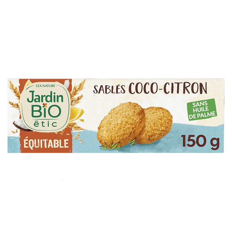 Jardin BiO étic vous propose une large gamme de biscuits dans une variété de saveurs qui se combinent parfaitement pour vous offrir une pause délicieuse. Découvrez la texture de ces biscuits sablés réalisés sans huile de palme, où la saveur sucrée du citron rafraîchit délicatement la note exotique de la noix de coco.