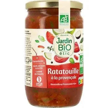Sans arômes ajoutés, cuisiné en France. La ratatouille Jardin BiO étic a été cuisinée avec des légumes soigneusement cuits, de l'huile d'olive et des herbes, pour un accompagnement gastronomique typiquement sudiste. Bon appétit.