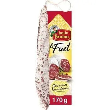 Justin Bridou a mis tout son savoir-faire pour vous proposer son Fuet. Le Fuet Justin Bridou est d'abord cuit à la vapeur, avant d'être lentement affiné, ce qui lui confère son goût très doux et sa forme irrégulière traditionnelle. Idéal pour surprendre vos amis lors d'un apéritif !