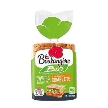 Le pain complet bio de La Boulangère avec de grandes tranches est fabriqué à partir de farine de blé biologique issue du commerce équitable français. Ses tranches généreuses au goût de pain complet en font le pain à sandwich idéal pour les toasts au petit-déjeuner, mais il peut également être consommé en sandwich pour varier les plaisirs.