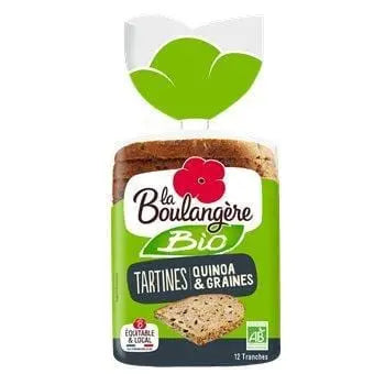 Les Tartines Bio de Quinoa & Graines de La Boulangère se caractérisent par leur mie aérée et fondante, généreusement saupoudrée de quinoa, de graines de lin brun et de graines de tournesol. Leur recette est élaborée avec de la farine de blé biologique provenant du commerce équitable français, combinée avec de la farine de seigle et de la farine deorge maltée rôtie, leur donnant une mie légèrement brune et un goût céréale. Elles peuvent être consommées au petit-déjeuner ou en accompagnement des repas.