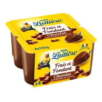 Frais et Fondant au Chocolat pur beurre de cacao par La Laitière est un dessert à la texture ferme et légère qui fond dans la bouche pour révéler toute l'intensité aromatique du chocolat. Il est fabriqué à Bayeux, en Normandie, à partir de bon lait français. Pas de colorants ou d'arômes artificiels.