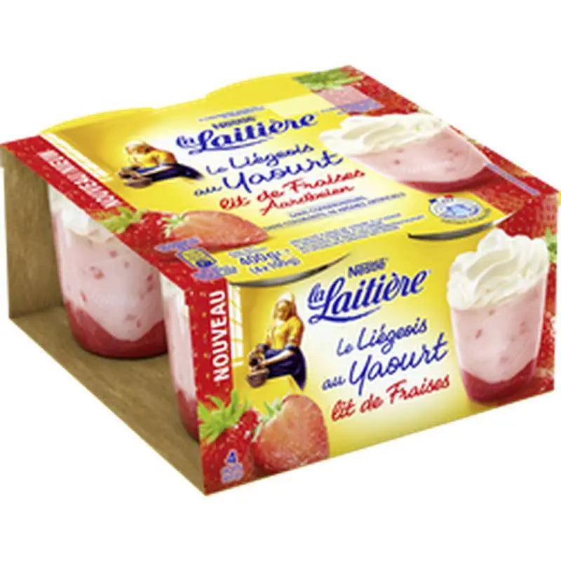 Yaourt sucré (51,9 %), LAIT écrémé, crème (LAIT), sucre, poudre de LAIT écrémé, protéine de LAIT, ferments lactiques, framboises (15,5 %), crème (LAIT), LAIT écrémé, sucre (7,5 %), poudre de LAIT écrémé, gélatine bovine, épaississant (pectine), arôme naturel, jus de citron, concentré de carotte. LAIT d'origine France.