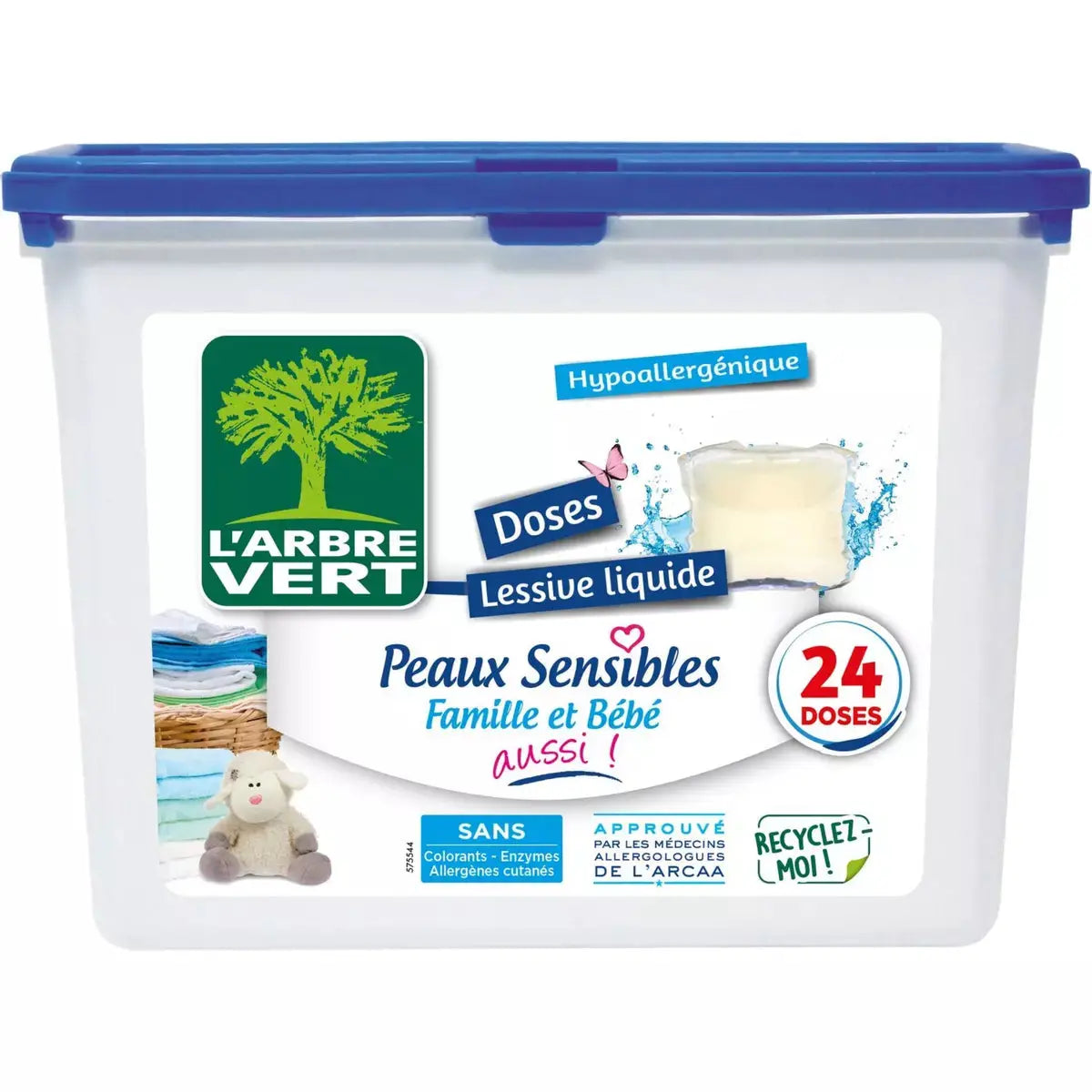 Le détergent liquide L'ARBRE VERT en doses avec savon végétal est exempt de substances actuellement répertoriées par la réglementation européenne comme responsables des allergies cutanées. La composition ne contient pas d'agents de blanchiment optique, d'éthers de glycol, de phtalates ni de colorants. Il est hypoallergénique, testé sur des volontaires à peau sensible. L'emballage est 100 % recyclable. La formule n'est pas testée sur les animaux et est compatible avec les fosses septiques. La dose de détergent liquide L'Arbre Vert libère ses ingrédients actifs dès le début du lavage, pour garantir la meilleure efficacité.