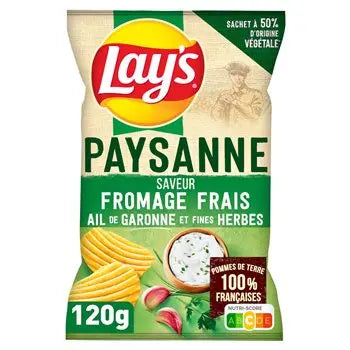 LAY'S PAYSANNE SAVEUR FROMAGE FRAIS, AIL & FINES HERBES : Des chips ondulées avec une saveur inspirée de la terre. Découvrez le goût unique du fromage frais associé à l'intensité de l'ail de Garonne et des fines herbes. SAVOIR-FAIRE TRADITIONNEL : Craquez pour la générosité des chips Lay's Recette Paysanne ! De grandes chips épaisses et croquantes avec un excellent goût de pomme de terre. CHIPS FRANÇAISES : Notre gamme Lay's Recette à l'Ancienne est entièrement fabriquée à partir de pommes de terre 100 % françaises. Nous sommes fiers de travailler avec nos agriculteurs français et d'utiliser leur savoir-faire agricole pour soutenir notre expertise en chips.