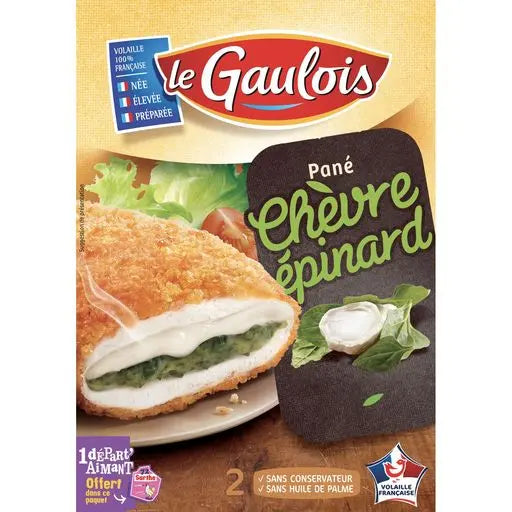 Viande de volaille séchée : 58 % (viande de poulet : 30 %, viande de dinde : 14 %, eau, fibres de BLÉ, dextrose de blé, sel), chapelure : 20 % (eau, farine de BLÉ, levure, sel, épices), sauce aux épinards : 12 % (épinards : 5 %, eau, CRÈME, amidon de manioc transformé, poudre de LAIT entier, sel, arôme naturel, huile de tournesol, épices, agent d'épaississement : gomme xanthane), fromage de CHÈVRE fondu : 10 % (FROMAGE DE CHÈVRE : 5 %, FROMAGE, protéine de LAIT, BEURRE, arôme, sel, amidon modifié : phosphate d'amidon, sels émulsifiants : citrates de sodium, agent gélifiant : carraghénane), huile de tournesol.